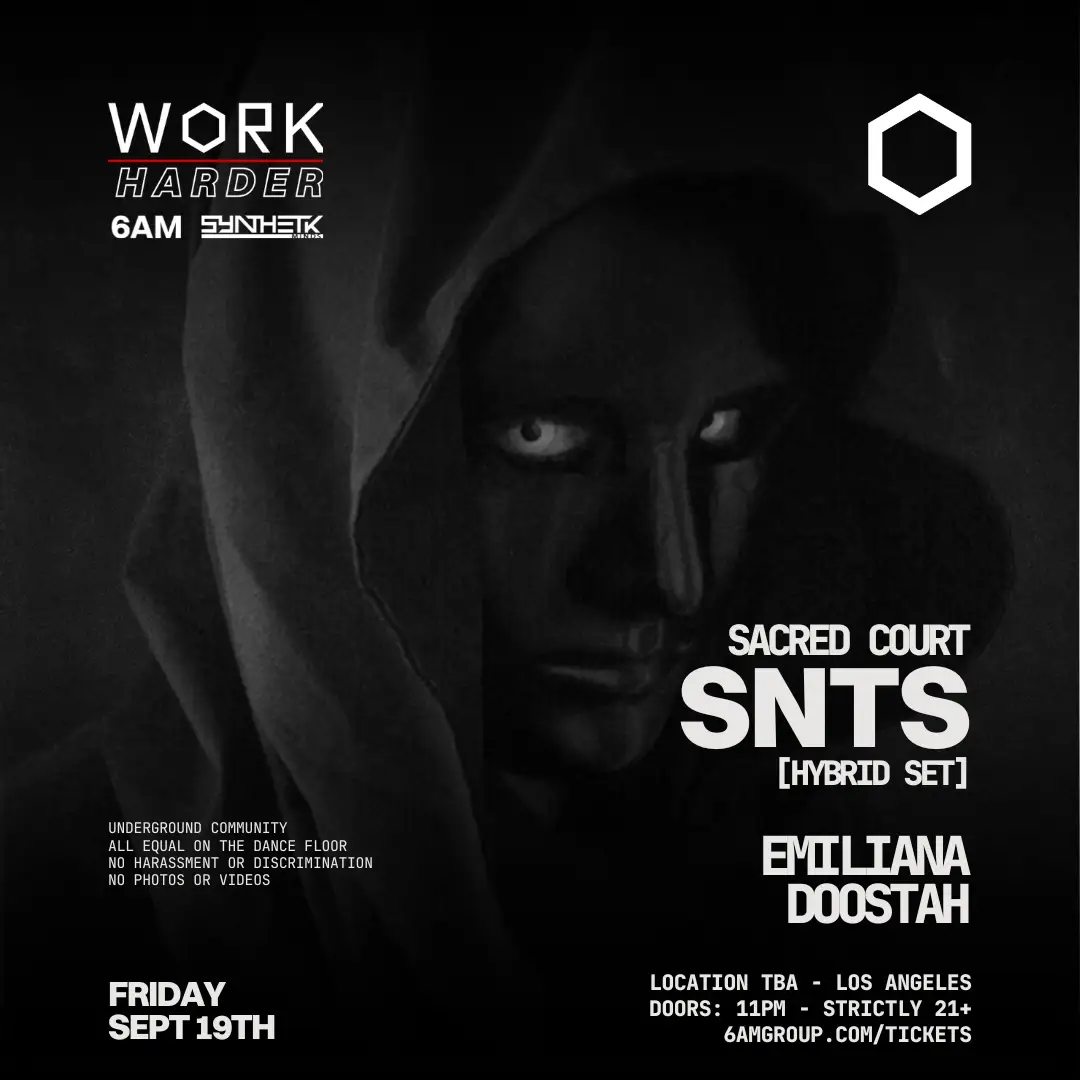 Friday, September 19th, WORK Harder Presents: SNTS [Hybrid Set], EMILIANA, & DOOSTAH. SNTS is the enigmatic force behind the acclaimed Sacred Court, a label synonymous with raw, industrial, and atmospheric techno rooted in industrial textures and haunting sound design. EMILIANA, founder of CTHRTC, a platform pushing dark, high-energy techno with an unfiltered, community-first ethos. Emiliana’s sets are a relentless blend of industrial grit, percussive momentum, and emotionally charged atmospheres. DOOSTAH, Born and raised in San Francisco and now rooted in Southern California, will make his debut at the WORK Warehouse. Known for his dynamic sets that span from driving peak-time techno to deep and groovy, he takes his listeners on immersive journeys through his thoughtful track selections. Location will be e-mailed to ticket holders 2 hours before the event starts. PLEASE OPT IN TO RECEIVE EMAILS FROM RESIDENT ADVISOR or you RISK NOT RECEIVING LOCATION DAY OF EVENT 1. Respect the Fragility of the Underground - Please do not loiter and pregame. Please respect the neighborhoods and venue. 2. Awareness is Key - If at any moment during your time inside our space and you feel unsafe, uncomfortable, unwell or notice unwanted behavior of any kind, please speak to a member of our staff, security or vibe host team. 3. We DO NOT Tolerate Hate & Discrimination - This is a SAFE SPACE to enjoy music and friendship. Anyone caught harassing, discriminating, disturbing others or breaking any of our policies shall be immediately removed and banned from all events. 4. CONSENT is MANDATORY 5. NO PHOTO/ VIDEO POLICY 6. Community and Music Above All Else