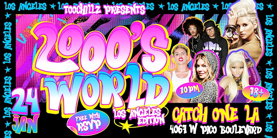 2000βs World takes over Catch One in Los Angeles on Saturday, January 24th. A full night of Y2K pop, hip-hop, and EDM! 2000βs World β Saturday, January 24th β Doors open at 10PM π₯ Step back into the 2000s in Los Angeles π₯ Get ready for a night packed with Y2K energy β pop, hip-hop, EDM, and all the throwbacks we grew up on. This is your night to relive the era! πΏ Pop, Hip-Hop, EDM & Y2K Throwbacks πΆ Expect nonstop bangers from the 2000s β high energy all night long, no breaks! π Catch One 4067 W Pico Blvd, Los Angeles, CA 90019 π 10PM β 2AM ποΈ Free before 10:30PM (18+) ποΈ Free before 11PM (21+) 18 and Over with valid Government I.D.