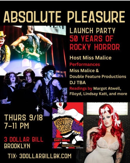 The Rocky Horror Picture Show, the beloved queer cult classic film, turns 50 this month. NYC has a special place in Rocky Horror history: it’s where the iconic traditions of callbacks and shadow cast performances were born. In the ABSOLUTE PLEASURE anthology, trans and queer writers explore the personal, political, and cultural impacts of the film. Featuring performances by Miss Malice and Double Feature Productions, readings from the book by Margot Atwell, Flloyd, Lindsay Katt, and more, and DJ TBA This night will make you shiver with antici… …pation Books and merchandise for sale from Hive Mind Books. ABSOLUTE PLEASURE is being published by Feminist Press.
