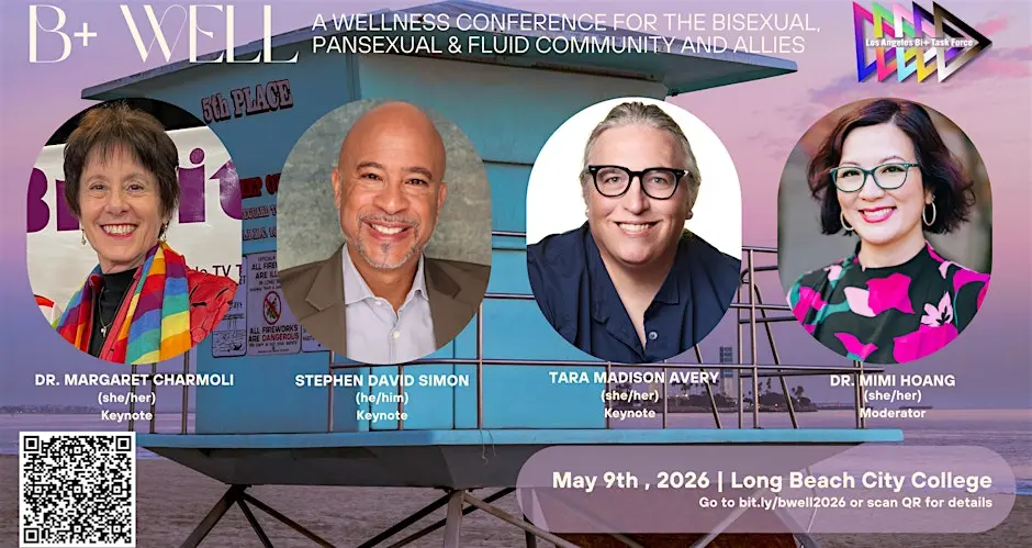Join the bi, pan, & fluid community in a day of collaborative learning, healing, and connection. B+ Well, May 9th at Long Beach City College We invite you to our 3rd annual wellness conference for the bisexual, pansexual, and fluid community!!! We promise a stellar speakers line-up and a full day of learning, healing, and connection with bi+ individuals and allies in Los Angeles and beyond. The event includes breakfast, lunch, and an afternoon mixer, plus a resource fair so that attendees can be connected with local wellness resources. This is a community retreat-style event and not an academic conference, so we encourage casual attire (though you may dress up if you wish!). We also offer a live stream option for those who can't attend in-person.