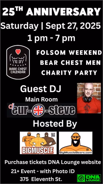BigMuscle.com is hosting our 25th Annual Charity Folsom event. All proceeds benefit Bare Chest Calendar and PRC., This is our big meet and greet before Folsom Sunday where you can make new friends or catch up with your current ones. We keep the music to background sounds so you can actually talk to the people.
