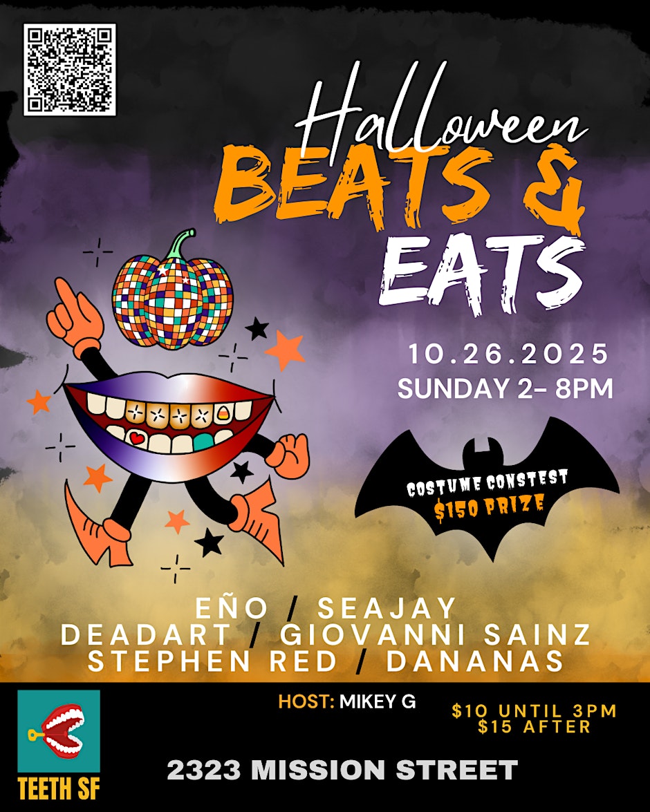 BEATS & EATS HALLOWEEN PARTY πͺ©πΉπππππ³οΈββ§οΈβ€οΈπ»ππΊ Sunday October 26th 2-8pm $10 ADVANCE ONLINE // $15 AFTER 3PM @ DOOR $25 DO GOOD WHILE YOU GROOVE(50% DONATION TO QUEER CHARITY TICKET) SEE YOU @ TEETH 2323 Mission Street SF $150 COSTUME CONTEST Host: Mikey G Lineup: SEAJAY DANANAS GIOVANNI SAINZ STEPHEN RED EΓO DEADART π Halloween: The Haunting Begins Here! Sunday Funday just got wicked.We're summoning all the night creatures into the daylight for a day party to die for. πΈοΈ Haunted house beats? Freshly conjured.π¦ Spooky snacks out back? Menu = π₯π Ghoul glam? Obvi.π§ All the dolls? Already crawled out.π Vibes? Frighteningly fierce. Itβs sunshine, sound, and slay to the grave.Letβs raise hell (and a glass) together. ππ½π·οΈπ³οΈβπSee you soon, if you dare. π»