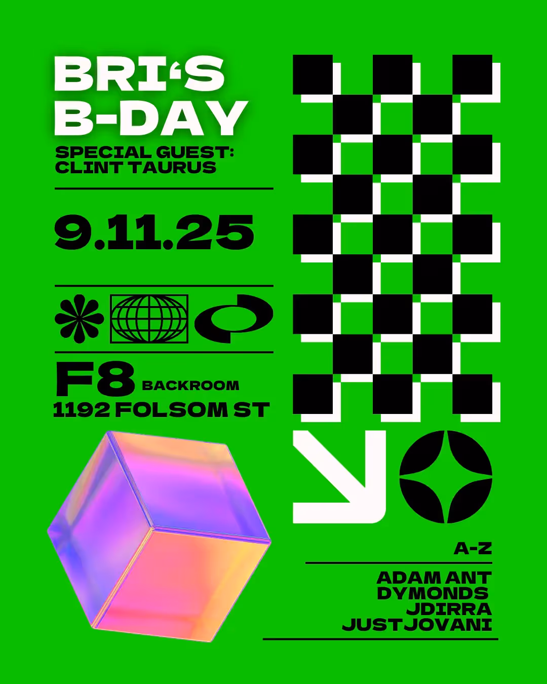 Bri is turning 17, and what better way than to celebrate them in the backroom of F8. It will be a night of laughs, hugs, cries, house, and gay tingz. Join us 10p - 2a Set Times 10-11 Dymonds 11-12 JustJovani 12-1 Adam Ant 1-2 Jdirra