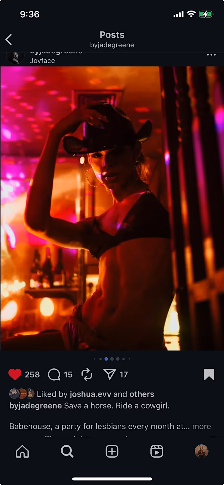 September 17th, BabeHouse goes BROKEBACK. Joyface, 9-late. $10 cover. Wear your best cowgirl fit. Featuring DJ Jenny Albright, and sapphic showgirls.