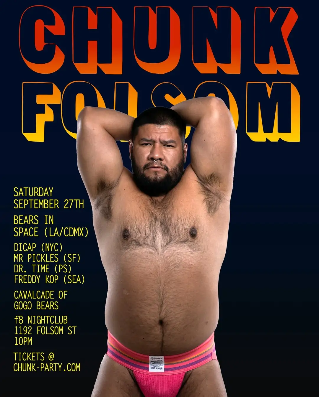 CHUNK SF presents BEARS IN SPACE FOLSOM '25 - Saturday September 27th 5 DJS // 2 ROOMS // CAVALCADE OF GOGO BEARS DJS - BEARS IN SPACE (LA/CDMX) // DICAP (NYC) // MR PICKLES (CHUNK RESIDENT) // DR TIME (Palm Springs) // FREDDY KOP (Seattle) f8 NIGHTCLUB // 1192 FOLSOM ST // 10PM - CLOSE // 21+ // ID RQ'D All tickets available on our website chunk-party(dot)com