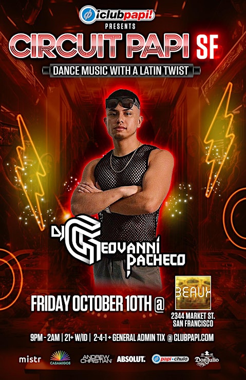 Club Papi invites you to CIRCUIT PAPI san francisco "DANCE MUSICA WITH A LATIN TWIST" on Friday, October 10th at the Iconic and newly remodeled BEAUX Nightclub, in the heart of San Francisco's #CASTRO Nightlife District. Reserve Tickets online Now for Guaranteed Entry! Direct from Houston, superstar DJ & PRODUCER GEOVANNI PACHECO + Opening Set with DJ Ben (Puerto Rico)| Sexy LA & SF Papi Go-Go's | Drink Specials All Night Long CIRCUIT PAPI SF features our unique sound of Latin | Tribal | Vocals & Mashups | 10 #Trophyboy Go-Go's by Andrew Christian |Strongest Drinks in #gaysanfrancisco | Check out our Website www.clubpapi.com for more info "AIN'T NO PARTY LIKE A CIRCUIT PAPI PARTY"