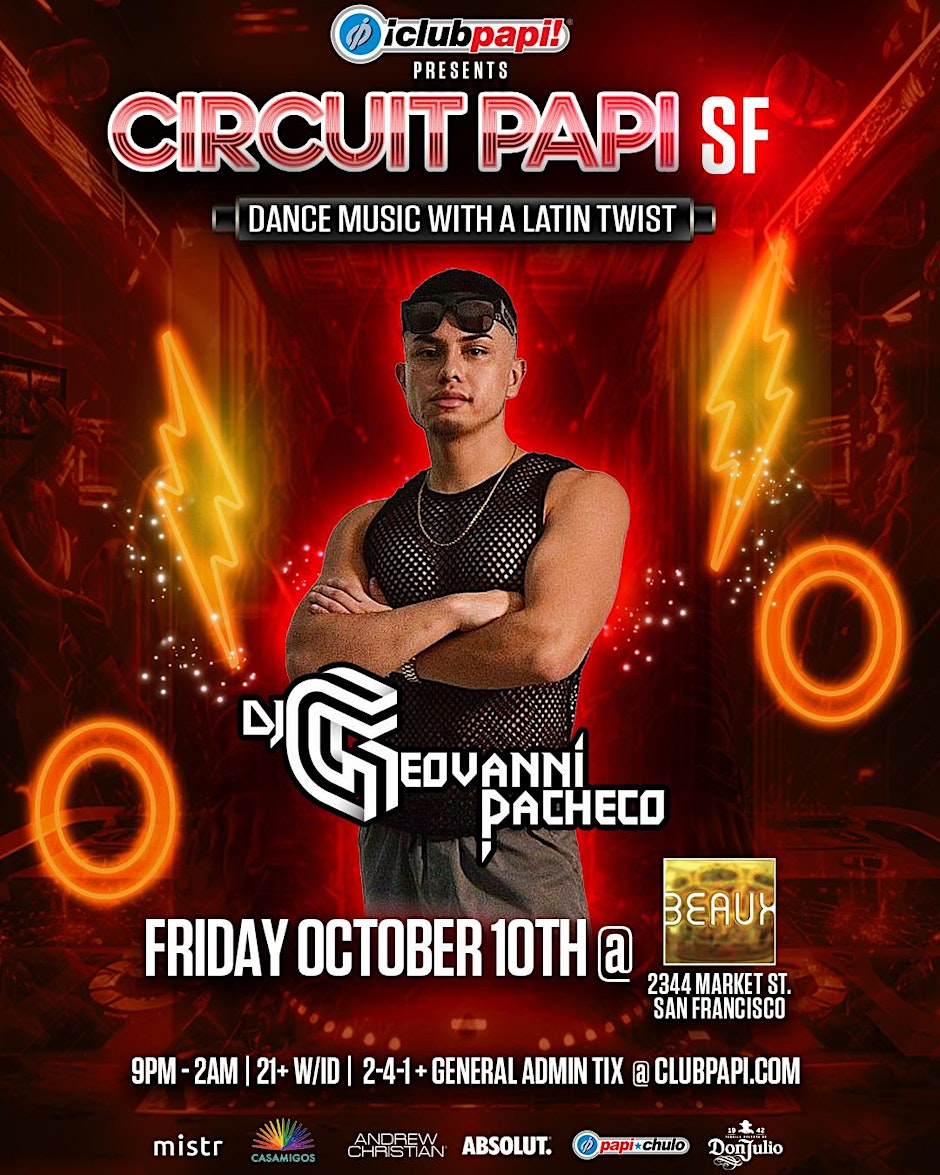 Club Papi invites you to CIRCUIT PAPI san francisco "DANCE MUSICA WITH A LATIN TWIST" on Friday, October 10th at the Iconic and newly remodeled BEAUX Nightclub, in the heart of San Francisco's #CASTRO Nightlife District. Reserve Tickets online Now for Guaranteed Entry! Direct from Houston, superstar DJ & PRODUCER GEOVANNI PACHECO + Opening Set with DJ Ben (Puerto Rico)| Sexy LA & SF Papi Go-Go's | Drink Specials All Night Long CIRCUIT PAPI SF features our unique sound of Latin | Tribal | Vocals & Mashups | 10 #Trophyboy Go-Go's by Andrew Christian |Strongest Drinks in #gaysanfrancisco | Check out our Website www.clubpapi.com for more info "AIN'T NO PARTY LIKE A CIRCUIT PAPI PARTY"