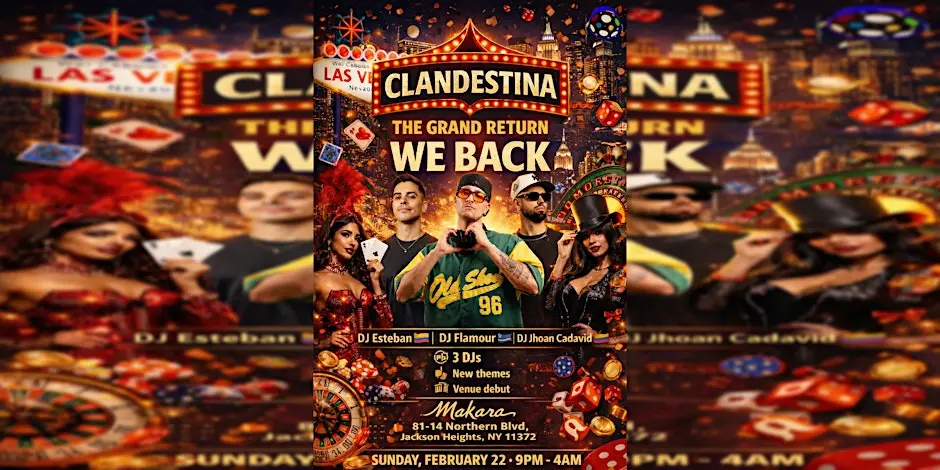 π°β¨ CLANDESTINA β THE GRAND RETURN β¨π° WE BACK The countdown is officially on. CLANDESTINA is back, bringing a night inspired by the lights of Las Vegas, underground energy, and pure nightlife freedom. ready for an immersive experience filled with neon lights, high energy beats, and an atmosphere where the music takes control from the moment you walk in. π DATE & TIME π Sunday, February 22 β° 9:00 PM β 4:00 AM π§ LINEUP β DJs π₯ DJ Esteban π₯ DJ Flamour π₯ DJ Jhoan Cadavid 3 DJs Β· New themes Β· Venue debut π LOCATION Makara π 81-14 Northern Blvd π Jackson Heights, New York 11372 Cards, dice, neon lights, and a seductive atmosphere set the stage for a night where limits disappear and the energy never drops. π² This is not just a party. π² This is CLANDESTINA. π² And weβre back.