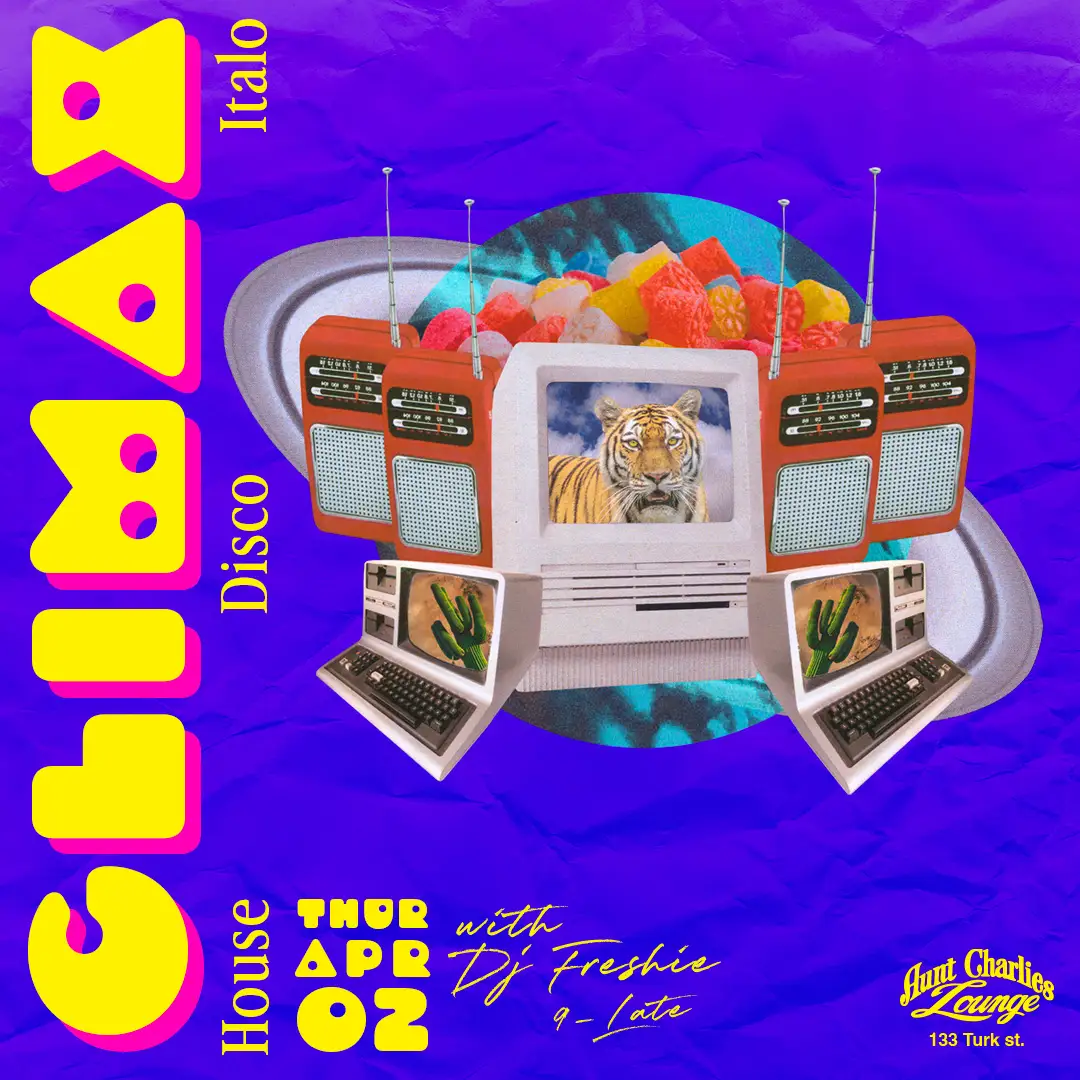 Climax returns with Dj Freshie to Aunt Charlie’s. a sonic soirée for the cosmically gifted. Immerse yourself in sultry House, crunchy underground Italo, and electro freestyle grooves from the far side of the moon. Let your inter-dimensional demons come out and play as DJ Freshie commands the decks ALL NIGHT!