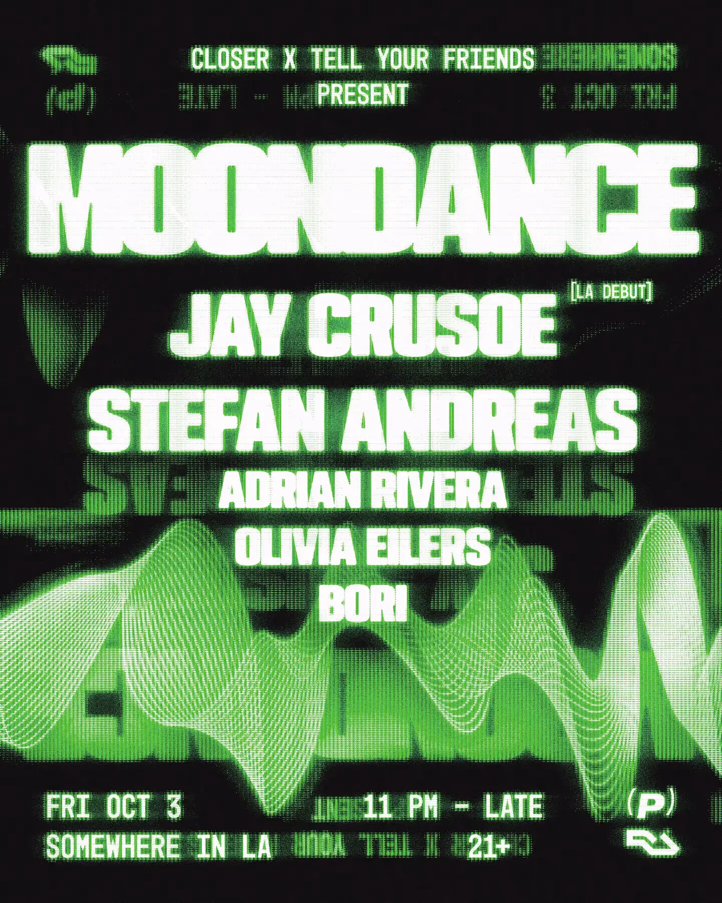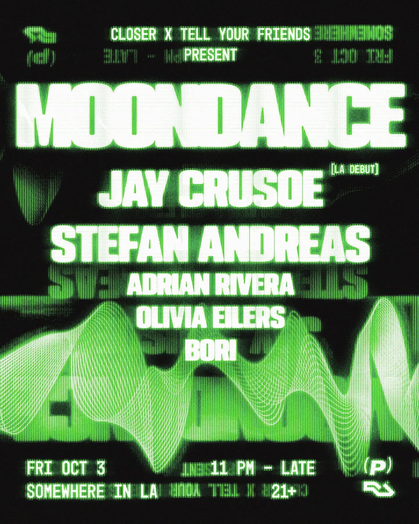 CLOSER x TELL YOUR FRIENDS presents MOONDANCE with Jay Crusoe (LA debut) CLOSER and TYF team up once again to bring you the finest house grooves, this time with the highly anticipated LA debut of Jay Crusoe. The Tampa-based producer/DJ has delivered releases on Groove Bassment, Hood Politics, Vibrancy, Materialism, South of Saturn, and Shalizi Group’s Modern Delivery Xpress, with heavy support from Fisher, Mau P, John Summit, Cloonee, and Black V Neck. His breakout single "Spontaneous Combustion" and a streak of charting releases have fueled his momentum, alongside performances at EDC Orlando, Sunset, Odyssey, and The Ground at Space Miami. Joining Jay is San Diego’s rising talent Stefan Andreas, whose track Play Me is gaining global traction, plus support from Adrian Rivera, Olivia Eilers, and Bori.