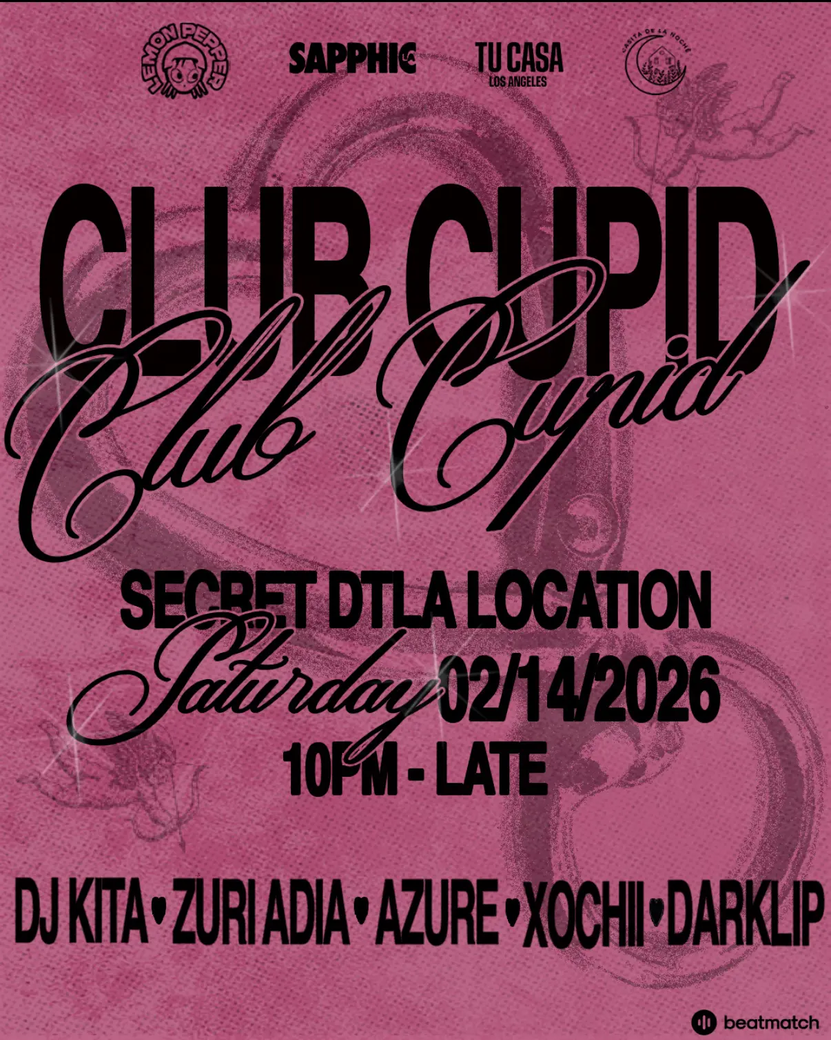 LEMON PEPPER x SAPPHIC LA x CASITA DE LA NOCHE x TU CASA PRESENT CLUB CUPID, THE VALENTINE'S DAY DANCE PARTY OF YOUR DREAMS <3 CLUB CUPID IS A SAPPHIC CELEBRATION OF EVERY TYPE OF LOVE. Bring your bestie, your boo, or come solo and find one ;) LINEUP: 🔥 AZURE 🔥 DJ KITA 🔥 ZURI ADIA 🔥 XOCHII 🔥 DARKLIP 10PM-LATE @ SECRET DTLA LOCATION (SENT DAY OF EVENT)