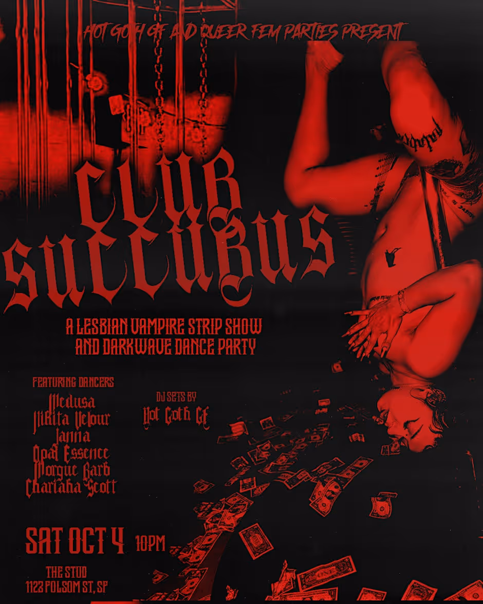 hot goth gf & queer fem parties present 🩸CLUB SUCCUBUS🩸 a sinister & seductive lesbian vampire strip show and darkwave dance party featuring Queer Fem Parties dancers 🩸Medusa 🩸Nikita Velour 🩸Janna 🩸Opal Essence 🩸Morgue Barb 🩸Chariah Scott & DJ Hot Goth GF vampire lesbian looks encouraged. bring cash tips for the dancers! 🩸SATURDAY OCTOBER 4🩸 The Stud 1123 Folsom St, SF 10pm-2am $15 advance, $20 door