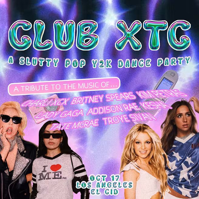Get your fix of pure pop euphoria. CLUB XTC brings together the iconic, dance-it-out anthems of the 2000s with the high-energy sounds of today's best pop artists. PLAYING MUSIC BY: Charli, Britney, Gaga, Kesha, Addison, Kim Petras, Doja Cat, Rihanna, Nelly Furtado, Slayyyter, Tate McRae and more THE VIBE: Unapologetic. Glittery. Grungy. Main character energy only. DRESS CODE: Y2K Core Your new obsession is here. *This is a tribute dance night. None of the artists mentioned will be appearing at this event, nor are they affiliated with the event.