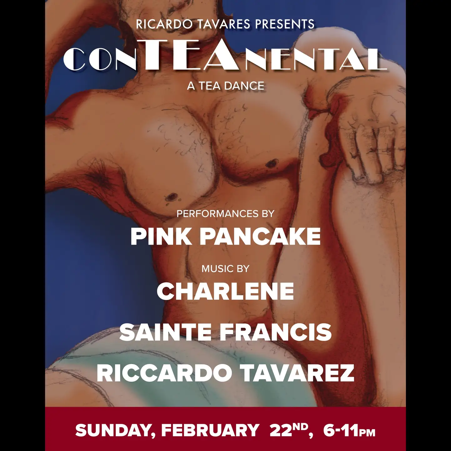 Ricardo Tavarez presents another great party This marks the debut of Pink Pancake — coming in hot with an unforgettable performance. And for the first time at ConTEAnental, Saint Francis brings the sound that will move the room. And of course, we have our grand dame, Charlene, ready to bring the house down! The hottest bathhouse party in NYC Sunday, Feb 22 | 6–11PM Performances by Pink Pancake Music by Charlene, Saint Francis & Riccardo Tavarez Come early. Stay late. Leave relaxed