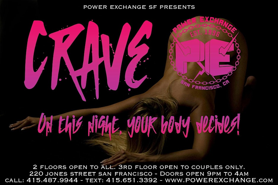 CRAVE: Sat Jan 31, 9PM–4AM. 2 floors open to all, 3rd floor couples only. A night of pure desire and adult freedom at Power Exchange. CRAVE – Saturday, Jan 31st | 9PM–4AM On this night, your body decides. CRAVE is where lust wins—a night built for those who refuse to hold back. Power Exchange opens 2 floors to everyone, with the 3rd floor reserved for couples only, creating a perfect mix of freedom, heat, and intention. No rules. No limits. Just desire unleashed. Dress Code: Sexy or fetish attire is highly encouraged. Dress like you’re going on a first date hoping to get lucky—be your best, and dress to impress. Where: Power Exchange 220 Jones Street, San Francisco, CA 94102
