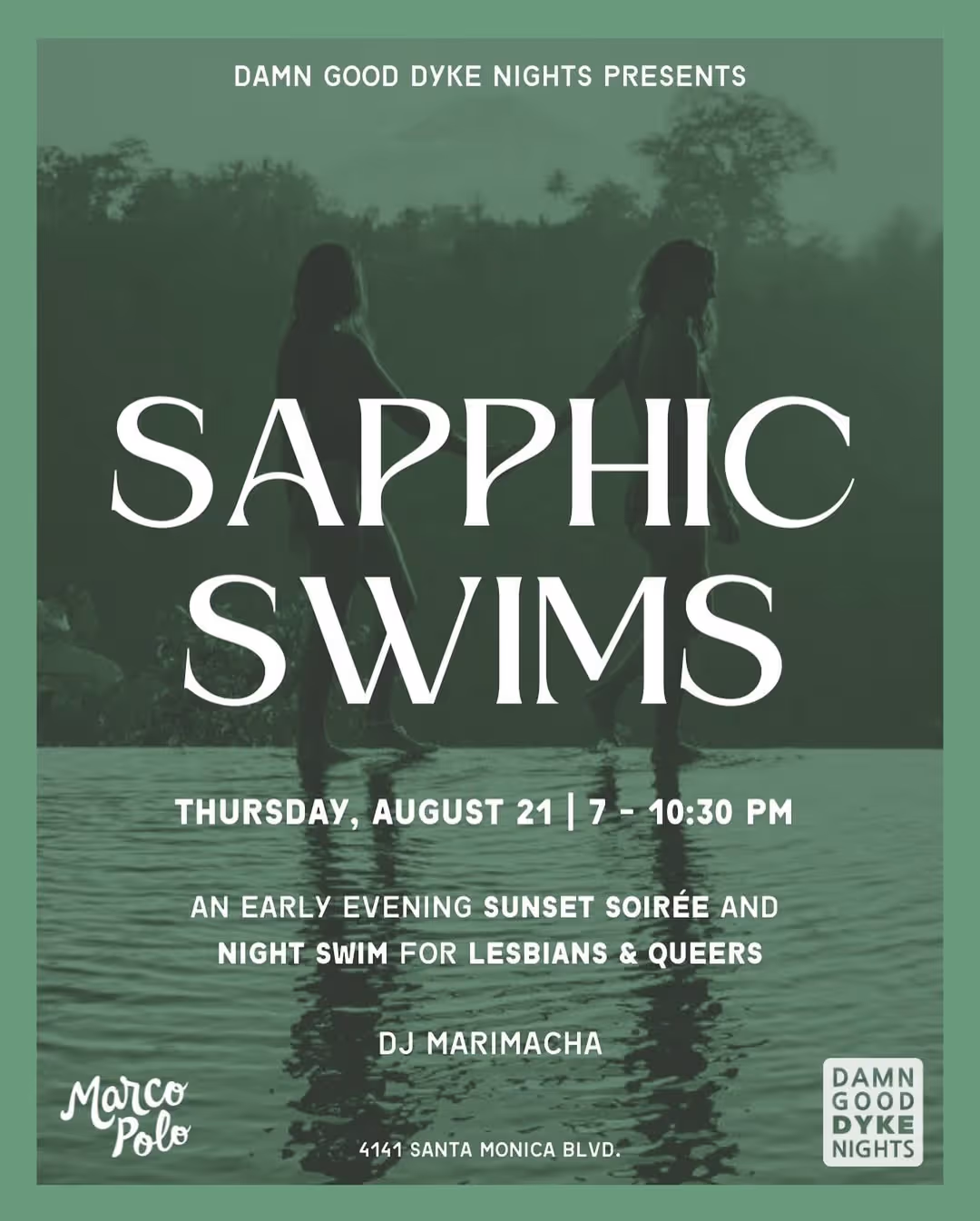It’s officially August, which means warm summer nights are here—and so is the next Sapphic Swims on Thursday, August 21 at the @silverlakepoolandinn! This month, we’re introducing glow stick wristbands at check-in to help you signal your vibe as the sun goes down and the lesbians and queers come out to play: 🟢Green = single / open to flirting 🩷Pink = taken / open to friendship (thanks to a community member for the recommendation! Glow bands are optional and regular paper wristbands will be available for those that do not want to partake) Expect poolside beats from @la.marimacha, refreshing drinks, splashing babes, and our signature dyke soup brewing under the moonlight! Tickets are limited and available ONLINE ONLY—no door sales. So grab your tix at the link in our bio and join us for another unforgettable night swim and sunset hang.