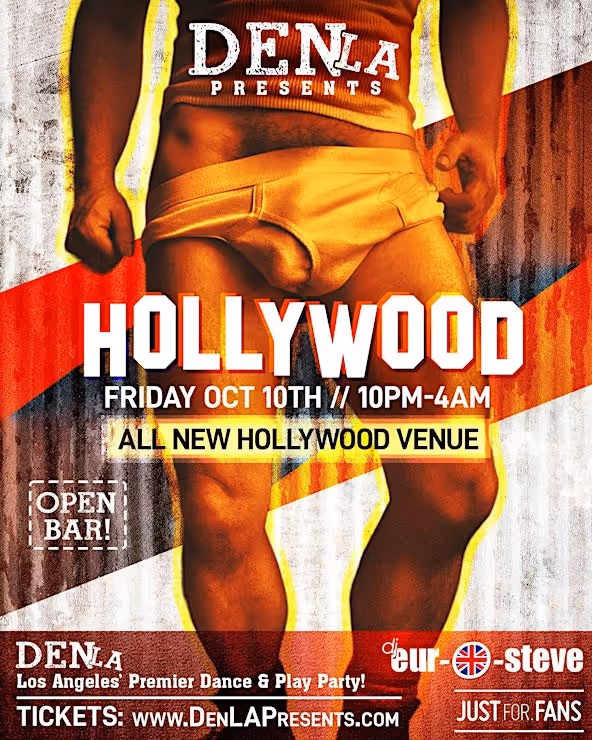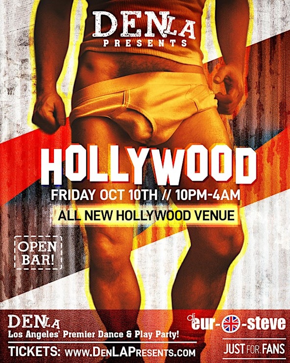 DenLA is Back! At a brand new Hollywood Venue. Bigger and better than ever! 🥃 Open Bar 🎧 DJ Eur-O-Steve 🔊 Fierce Lighting & Sound 🧥 Free Clothes Check ⛓ Slings, Darkrooms & Sex Furniture 💆🏻♂ Massage Masters 😈 Hot Men