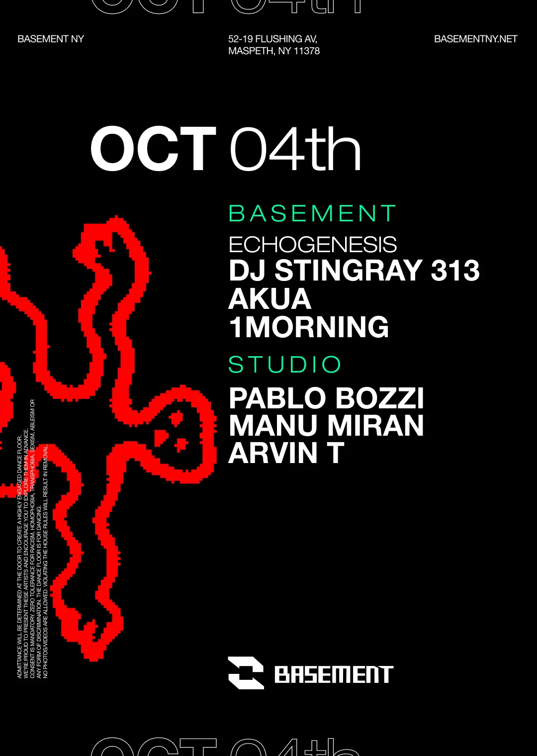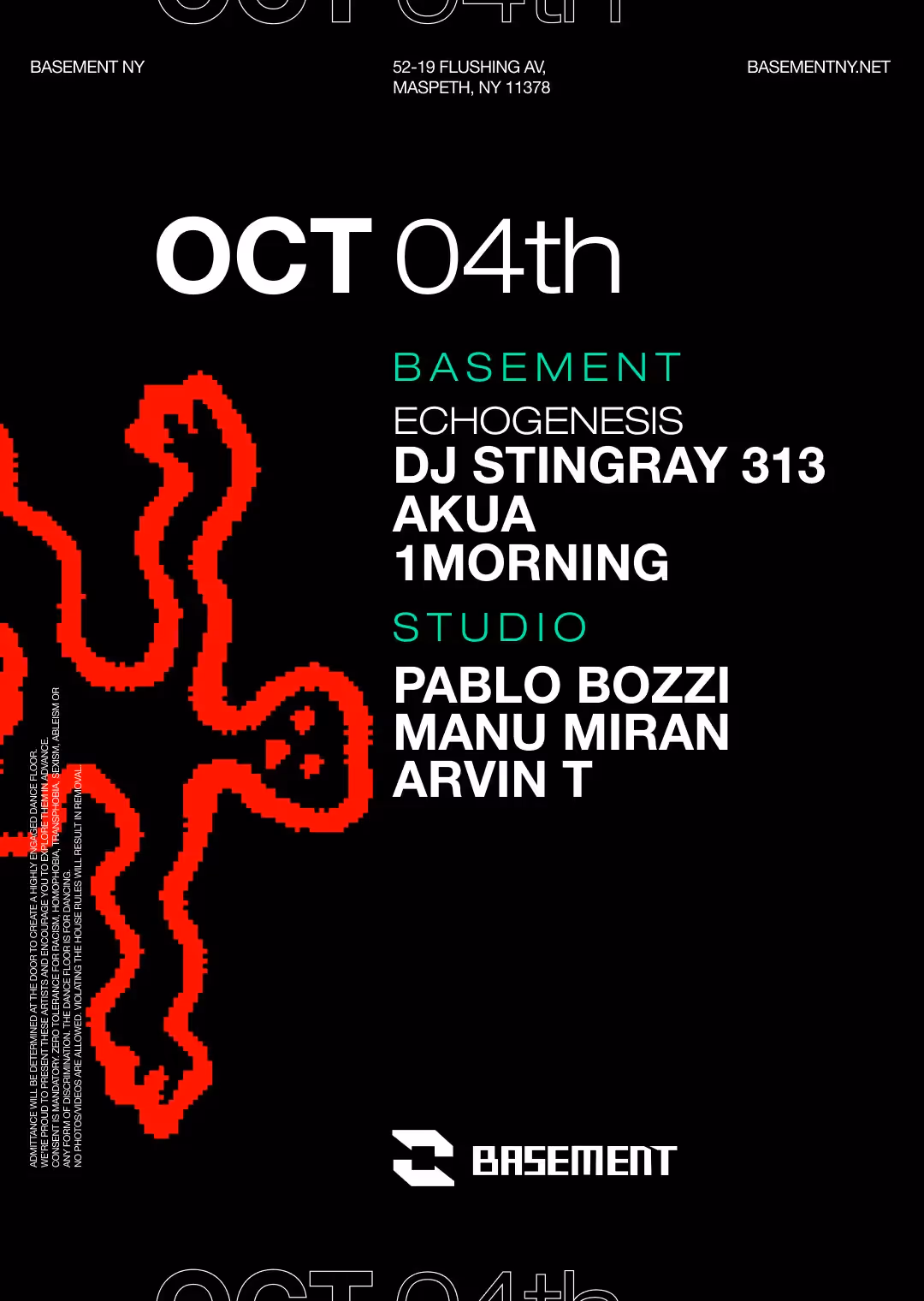 This October, DJ Stingray 313 presents Echogenesis: a new, groundbreaking tour where he’s joined by two of the most exciting and impactful voices of the modern era: Akua and 1morning. What all three share is a deeply-rooted connection to the revolutionary core of techno as well as a vision for its future that honors a spirit of unbounded innovation. The “echogenesis” refers to this “creation of resonances that ripple through generations, spaces and minds… it catalyzes reverberations that extend far beyond the immediate dancefloor.” This certainly rings true for Stingray. An architect of electro and modern techno, Stingray is an artist whose innovative spirit and sense of relentless exploration cannot be contained. He is a master DJ, a prolific producer whose works sound like no one else and an omnivorous seeker across mediums and forms. His backstory is of a piece with the development of Detroit’s second wave of techno, and his collaborators stand amongst some of the most essential voices in the genre. Akua represents the faster, harder edge. Having emerged in the NY underground approximately a decade ago, Akua has made herself into an artist of international renown. Playing with a feverish drive, Akua harnesses the rhythmically dense with razor sharp focus. 1morning returns from Los Angeles, matching the speed and urgency with a serious dose of funk. Capturing the cutthroat wildness of classic battle techniques and the seething propulsion of the best ‘90s techno, 1morning’s music feels like a revelation. He distills the best of the genre and uses it as a launchpad into the future. Pablo Bozzi has ascended over the past few years to the level of folk hero, consistently sending audiences on a euphoric high with one legendary set after the other. A quick skim through his exemplary catalog will give you more than enough of an idea what he’s about; track titles like “Neon Dreams”, “Fantasy” and “Danger Zone” speak to a consuming love affair with the best, most garish aspects of the ‘80s. But Bozzi never feels dated, finding creative frisson in that era’s trademark sounds. Manu Miran has become one of the key figures in the NY underground over the last few years. The Visceral founder taps into an unruly vein, with coursing, hedonistic grooves pulling you into an undertow. Arvin T returns. The Gabriela resident draws on the pulsating sounds of italo disco, raw house and ravey acid. His own productions for E-MISSIONS and Return To Forever glisten with sharp edges and shimmering surfaces.