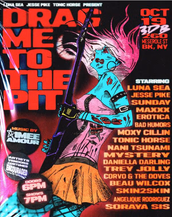 Drag Me To The Pit is a night celebrating queer artists in the city. Drag performers and live bands combine for a night of head banging and cunt ! Put on your best costume and join us for a horrific night filled with jaw dropping SPOOKY performances and rocking tunes all night long.With queer artists, vendors, and performers there’s something for every ghoul at Drag Me To The Pit.