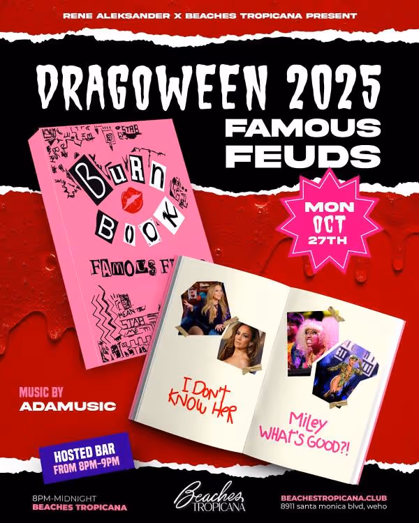 This Halloween season, it’s the perfect time to have fun in drag. ✨ Beaches Tropicana’s annual DRAGOWEEN event is a special night for those who are drag curious and drag veterans alike! This year’s theme — “Famous Feuds” — celebrates the most iconic rivalries in pop culture. Those who are at odds or been pitted against eachother by the public. Think Taylor vs. Katy(or Charli XCX), Cardi B(or Miley) vs Nicki Minaj, Britney vs. Xtina, Barbie vs. Bratz, Lady Gaga vs Madonna, Katseye vs Sydney Sweeney or your own creative twist. Grab your crew, pick your feud, and hit the runway serving drama, fantasy, and flair. 🎤 Special Performances & Guests 🎧 Adamusic on Decks 💵 Cash Prize for Best on theme Look or Group Feud 🍸 Cocktails • Queens • Chaos Whether you’re a first-time queen or a once-a-year showstopper, this is the night to let your alter ego out to play. Be bold. Be shady. Be iconic.