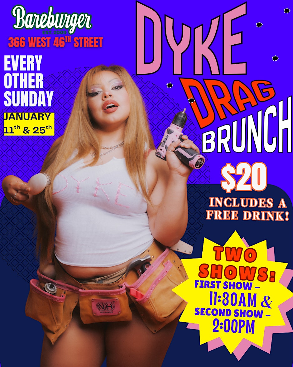 By dykes, for everyone. Your favorite lesbian's favorite lesbian drag show's drag brunch is taking Hell's Kitchen! Join us for DYKE DRAG BRUNCH on Sunday, January 11 at 11:30 am or 2 pm at Bareburger on West 46th St for sapphic shows, burgers (meat and veggie, lesbians), drink specials and more. Featuring special guest performances by Mr. Fire Island Hot Body 2024 Mauve, and Ru Paul's Drag Race Season 16's Amanda Tori Meating! Seating is first come, first serve, so arrive early to guarantee seats with your group, or come make new best friends at shared tables! Solo cuties will be at shared tables or bar seats <3 Get your tickets now before price increase at the door!