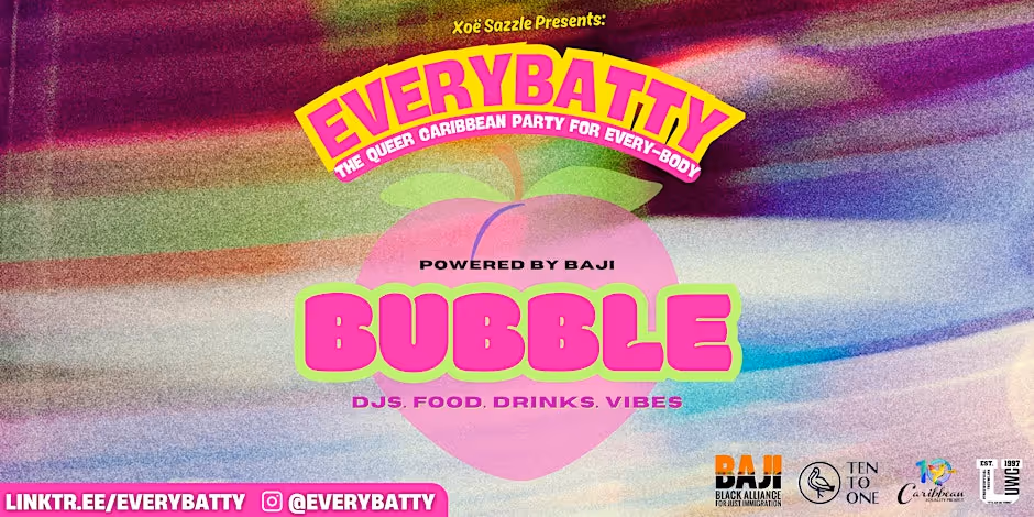 E V E R Y B A T T Y โ the Queer Caribbean Party for EVERY-BODY! ๐ We are BACK and bringing you BUBBLE: The Wining Edition โ a day to wine, lime, and celebrate queer Caribbean joy together. ๐๐ฝ๐น ๐ Sunday, October 19, 2025 โฐ 3โ8PM ๐ 512 N. Hoover St., Silverlake EVERYBATTY is more than a party โ itโs a safe, affirming space where we gather as children of one rainbow nation to share music, food, and culture in freedom. ๐โค๏ธ๐๐ If finances are a barrier, email us at everybatty@gmail.com for community entry. Brought to you in proud partnership with Black Alliance For Just Immigration, Caribbean Equality Project, Ten To One Rum and Unique Woman's Coalition.