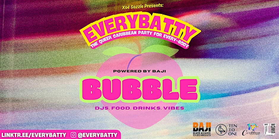 E V E R Y B A T T Y β the Queer Caribbean Party for EVERY-BODY! π We are BACK and bringing you BUBBLE: The Wining Edition β a day to wine, lime, and celebrate queer Caribbean joy together. ππ½πΉ π Sunday, October 19, 2025 β° 3β8PM π 512 N. Hoover St., Silverlake EVERYBATTY is more than a party β itβs a safe, affirming space where we gather as children of one rainbow nation to share music, food, and culture in freedom. πβ€οΈππ If finances are a barrier, email us at everybatty@gmail.com for community entry. Brought to you in proud partnership with Black Alliance For Just Immigration, Caribbean Equality Project, Ten To One Rum and Unique Woman's Coalition.