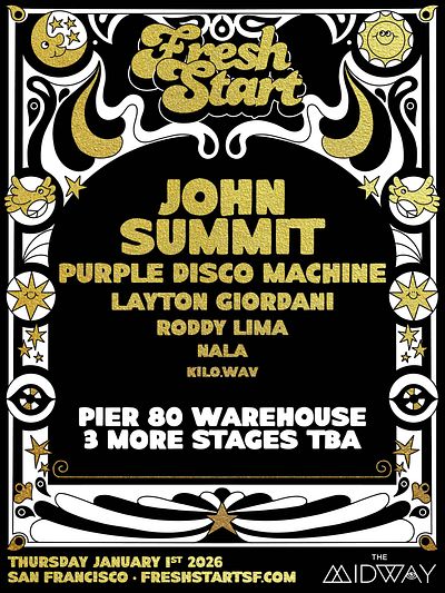 John Summit, Purple Disco Machine, Layton Giordani + many more Kick off 2026 with Fresh Start, San Francisco’s signature New Year’s celebration returning on January 1 for its seventh year. This year’s event takes over Pier 80 Warehouse, The Midway, and 888 Garage for an unforgettable day of music, energy, and connection. Headlining the lineup are John Summit, Purple Disco Machine, and Layton Giordani, delivering a full spectrum of house and techno that will set the tone for the year ahead. Each venue will feature its own immersive world of light, sound, and art—Pier 80 as the main stage spectacle, The Midway as the creative heart, and 888 Garage as an intimate, high-energy space for true music lovers. Since 2018, Fresh Start has brought thousands together to welcome the new year on the dancefloor. Join us as we turn the page to 2026 with a celebration that’s bold, beautiful, and unmistakably San Francisco. 21+ Event