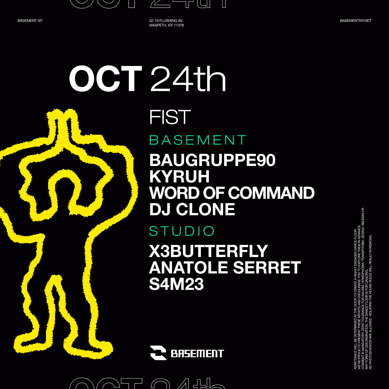 Two years ago, BAUGRUPPE90 made their debut at the club for FIST. Now, they return to headline the party. The Berlin duo is fresh off the release of their “Laser Cut” EP on their freshly-minted MONTAGE label, and it’s one of the best entries in their growing discography. Full throttle rave power meets liquid textures and swung, rolling percussion, all deployed with the effortless craft that is the duo’s signature. KYRUH is an artist whose ethos is a perfect fit for FIST. Her raw and devious mixing hits with pure, unfettered determination. KYRUH takes techno seriously, wielding the genre like a sword. Residents Word of Command and DJ Clone complete the night with their b2b. There’s an apocalyptic fervor to their collaboration, a sense of looming darkness and the rush of the paranoid that makes their b2b essential listening. x3butterfly headlines STUDIO. A key player in NY’s current era, x3butterfly’s fearlessness and fluency can be blinding. Whether playing a house-classics set, swerving through the heaviest dubstep or pushing the pedal to the metal for a huge rave, they always command the room. Berlin-based producer Anatole Serret makes his debut. An artist whose work moves between worlds, Serret has long-since established himself as a drummer in the breezy, beloved indie-funk band Parcels. But a series of head-turning EPs of driving, progressive-informed house kicked off a new chapter. His most recent transmission, “Fata Morgana," released on his own Hydrangea Records, showcases his fluid percussive sensibility and a straight-to-the-point soulfulness. S4M23 returns to the room, delivering a proper dose of midwest power. With jacking drums, searing acid licks and a tinge of menace, S4M23 spares no one.