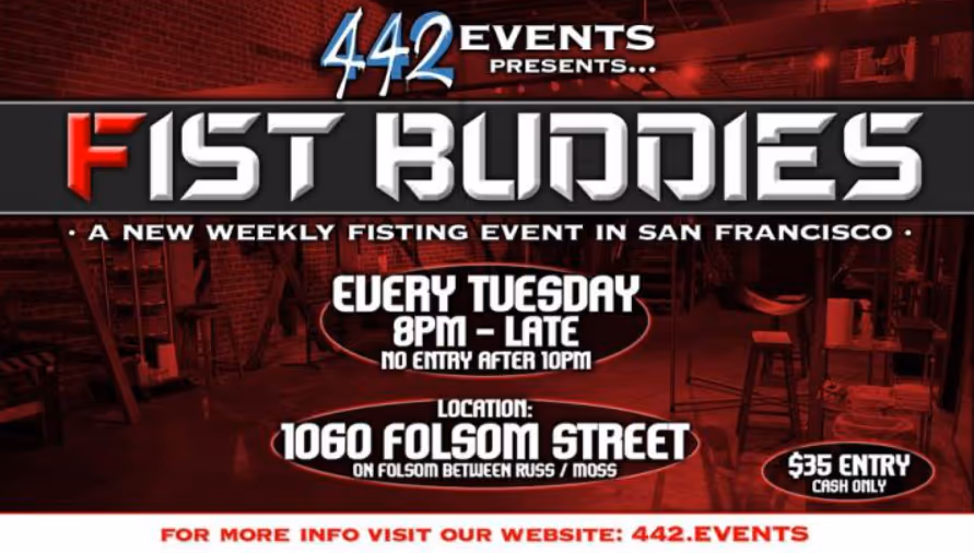A play party for men who are into fisting. THE HOST SAYS : "FFist Buddies is our BRAND NEW weekly fisting event which will be held every Tuesday. The main dungeon area will be set up for guys who want to explore fisting. We will have extra slings, fisting lube, plenty of paper towels, a bit more lighting then usual, and more."
