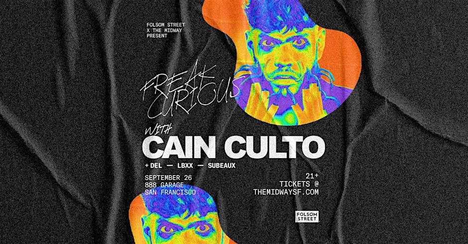 Are you a freak? Or are you just curious? Kick off the Folsom Street Fair weekend with music hot enough to turn you out. Get ready for an intimate and immersive musical experience that only Folsom Street could bring you. Cain Culto's music "takes cues from the folk music of Appalachia and Colombia, specifically vallenato and bullerengue, mixing political lyrics with drums and violin creating a sound that only he could produce. As a visual artist, he blends queerness, witchcraft, and myth, taking listeners on a journey that is just as imminently iconographic as it is auditory." (Richie Goff, QueerKentucky.com) Here at Folsom Street we're OBSESSED. The bass will be filthy, the vibes will be immaculate, and you will be filled...with queer joy. Supporting artists include: LBXX (pronounced Lunch Box), local pop-hop performer, turntablist, and Makeroom Collective cofounder, can’t be contained. Combining East Coast energy with West Coast calm; hip-hop beats with pop hooks; and conventional rap rhymes about manifesting money, cars, and fame with soulful stories of boys and heartbreak, the up-and-coming San Francisco artist defies traditional music boundaries. Subeaux (aka Zaheer Suboh), is a queer Palestinian DJ, producer, and community organizer, whose mixes fuse Arabic percussion and strings into disco, house, and techno DJ sets. Drawing from their roots in Palestine and their presence in San Francisco's underground scene, Subeaux has become a staple performer during SF's queer High Holidays, soundtracking events that are emblematic of the city’s nightlife and community celebrations, and most recently performed at Outside Lands 2025 on the Dolores Stage. Del is originally from NYC, and now an Oakland based DJ legend. Her original interest in music was sparked by an older brother’s obsession with vinyl and a mother that forced her into playing instruments at a young age. Her DJ sets are heavy with hip hop, club music, baile funk, tech house, garage, hard techno, and dubstep but are mainly influenced by whatever she got off soundcloud that week. The bar will be serving and so should you. Don’t wait- tickets on sale now! 21+