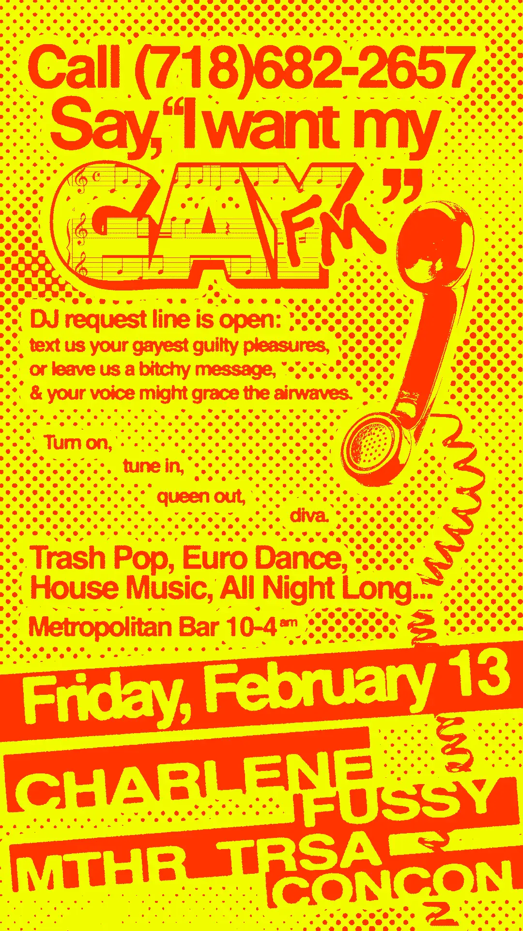 flooding the radio waves with only the finest trash pop, eurodance & gay music, all night long. request line is open. tune in to the radio, or leave us voice mail: (718)682-2657 request line is open. tune in to the radio, or leave us voice mail: (718)682-2657 request line is open. tune in to the radio, or leave us voice mail: (718)682-2657