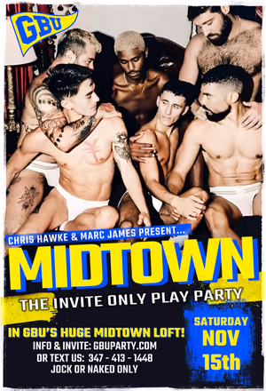 A JOCK/NAKED PARTY IN GBU’s HUGE MIDTOWN LOFT — SAT 11/15 Jock or Naked ONLY! Complimentary Drinks Live DJ