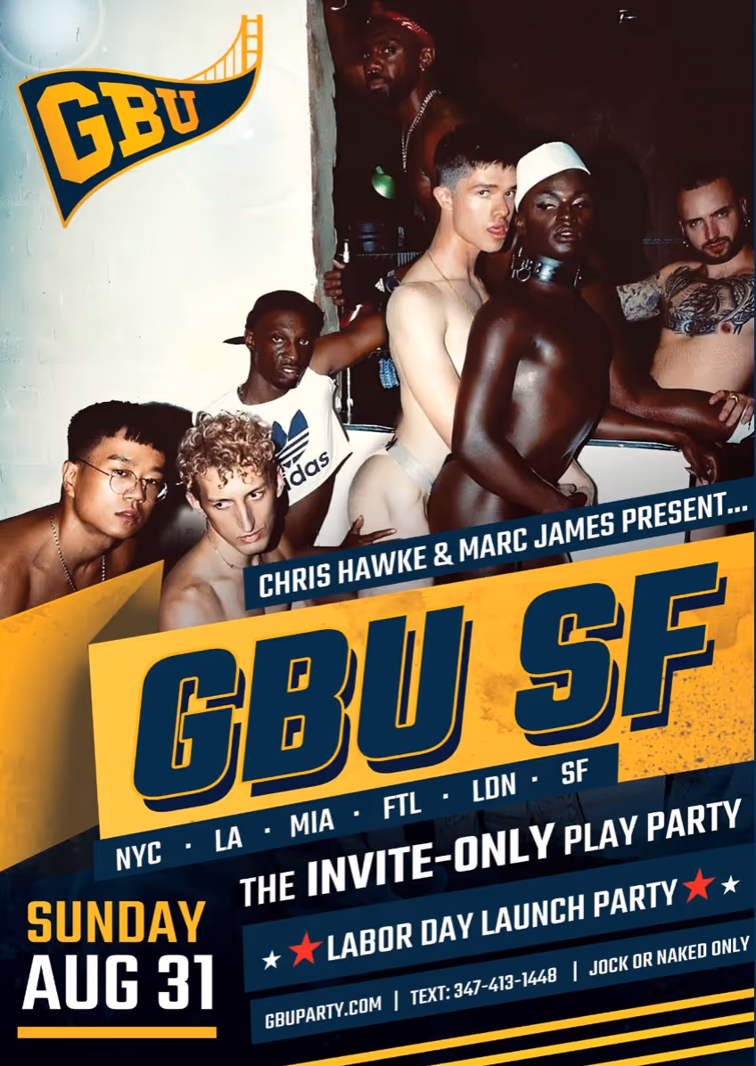 GBU is the Invite-only warehouse *play* party where the music and vibe is filthy and the guys come ready! Two decades deep in NYC, LA, Miami, Fort Lauderdale, and London—now it’s San Francisco’s turn. Launch party on SUN, 8/31 - LABOR DAY WEEKEND!! This is invite-only. Slide in at gbuparty.com/sanfrancisco or text 347-413-1448