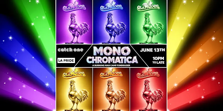 The GlamCocks are back with their annual pride party! This year's theme is Mono Chromatica: choose a color, deck yourself out head-to-toe in that color, together we bring the rainbow🌈 Who are the GlamCocks? We are a far and wide community of burners. Our mission: to create safe communal spaces for all to enjoy and feel their most authentic self. All proceeds from events go toward funding art projects, nightlife offerings, philanthropic efforts and community workshops at Burning Man. Don’t miss out! We sell out every year. Come be a part of LAs biggest pride party. We can’t wait to welcome you!