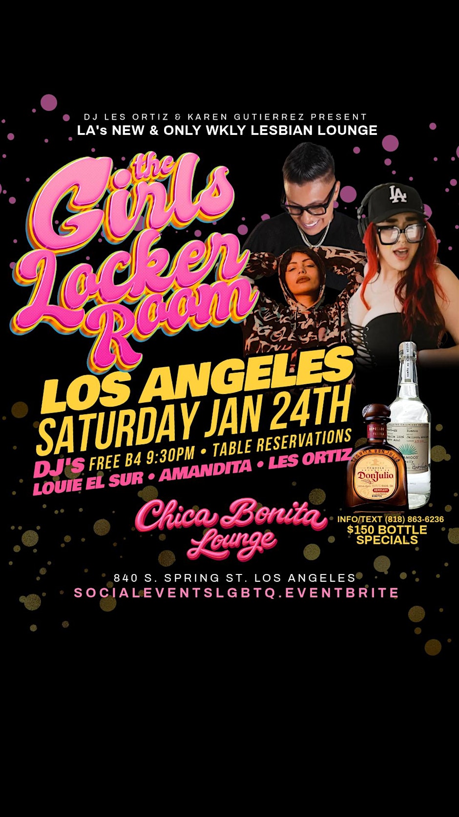 The Biggest Gxrl Party in the E.I. “Girls Locker Room” comes to DTLA located inside LA’s ONLY Lesbian Lounge “Chica Bonita” Girls Locker Room at Chica Bonita Lesbian Lounge DTLA Get ready for a night filled with great vibes and amazing beats at Chica Bonita! Join us & GLR as we bring the vibes to DTLA!!! Bringing the vibes Dj Les Ortiz, DJ Amandita & special guest Louie El Sur from the Bay Area. Whether you wanna dance, chill, or just soak in the atmosphere with your Queer community, this is the place to be. Don't miss out on an unforgettable night in downtown LA!