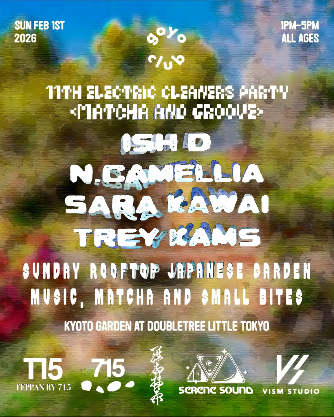 goyo club presents 11TH ELECTRIC CLEANERS PARTY - MATCHA AND GROOVE goyo club exists to curate and archive artists of many kinds through cinematic videos in local spaces to empower our community. goyo club party will feature djs from our electric cleaners archive series, which curates and archives live mixes of talented djs in a family owned dry cleaners in koreatown, los angeles. please join us to experience the electric cleaners in real life, to feel the music in person, and to meet our incredible lineup of talented local djs. SUNDAY DAYTIME ROOFTOP PARTY AT A JAPANESE GARDEN Ish D @ishd TREY KAMS @treykams SARA KAWAI @idfksara N.CAMELLIA @camelliagreentea take part in our movement to bring our community together and build a platform for local artists and family owned spaces, shining light on the culture built in the corners of our city and the people who keep it growing. SUN 2/1 1PM-5PM Doubletree Little Tokyo Kyoto Garden