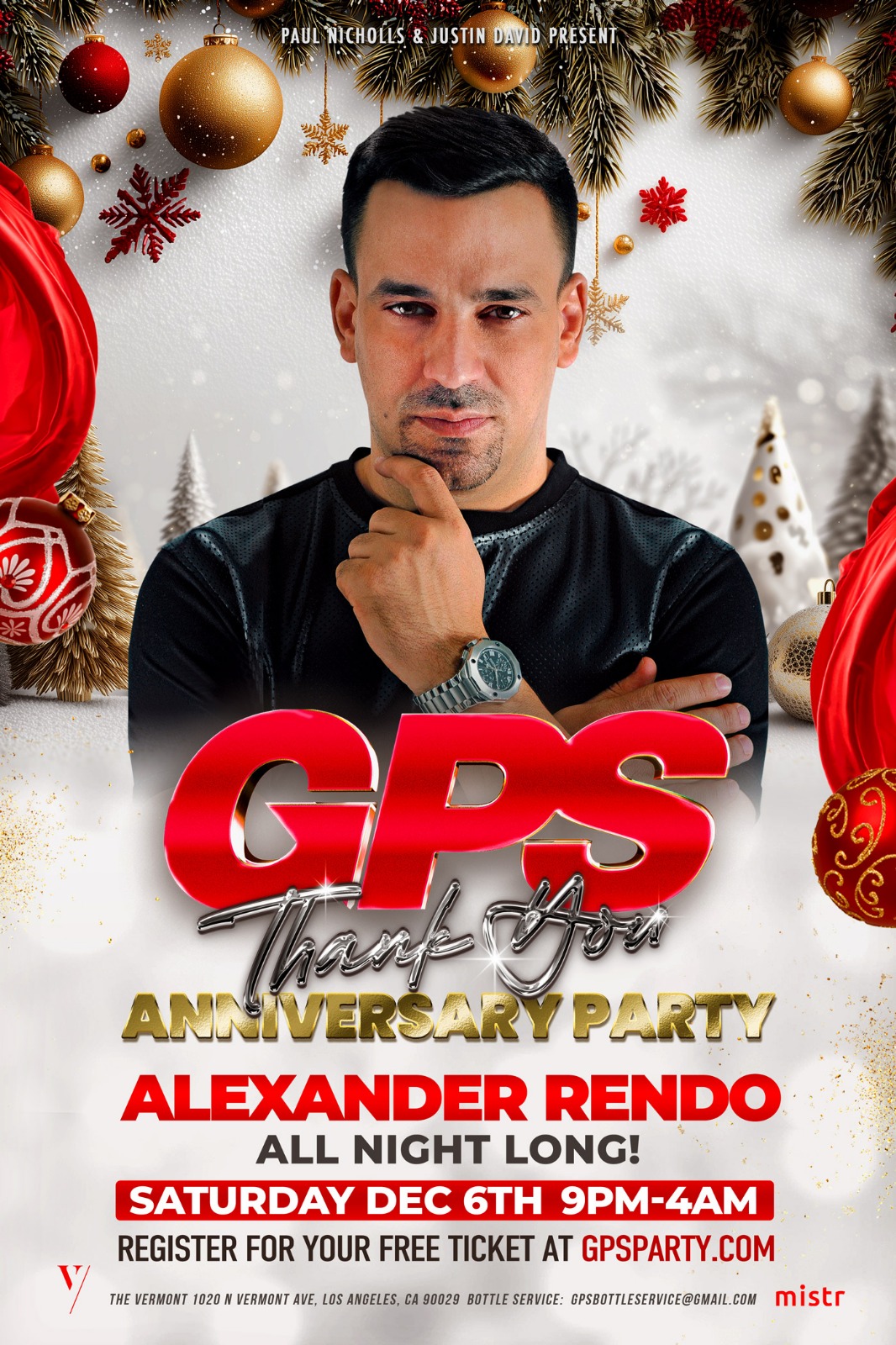 Buy Tickets GA Tickets TICKET TYPEPrice per TicketQuantity GA Early Arrival FREE GA (arrive B4 11pm or $20 fee)(21+)$0.00 STRICTLY 1 TICKET PER PERSON AND EMAIL - DUPLICATE NAMES AND EMAILS WILL BE AUTOMATICALLY VOIDED WITHOUT NOTICE! *ARRIVE BEFORE 11PM OR PAY $20 AT DOOR GA PreSale (arrive anytime)(21+)$18.25 ($15.00face value + $1.54facility fee + $1.71service fee) ARRIVE ANYTIME! VIP Tickets TICKET TYPEPrice per TicketQuantity VIP Early Arrival VIP (arrive B4 11pm or $20 fee)(21+)$23.28 ($19.00face value + $2.00facility fee + $2.28service fee) ARRIVE BEFORE 11PM (OR PAY $20) & ENJOY VIP EXPRESS ADMISSION AND ACCESS! VIP ADMISSION (arrive anytime)(21+)$34.95 ($29.00face value + $2.68facility fee + $3.27service fee) ARRIVE ANYTIME & ENJOY VIP EXPRESS ADMISSION AND ACCESS! Print@Home / Mobile - FREE CHECKOUT SATURDAY DECEMBER 6 - 9pm - 4am THANK YOU FOR A RECORD-BREAKING DESERT HEAT PALM SPRINGS PRIDE! WHAT BETTER WAY TO CELEBRATE OUR ANNIVERSARY THAN WITH A FREE PARTY! GPS: THANK YOU ANNIVERSARY PARTY FULL GPS PRODUCTION AT THE VERMONT HOLLYWOOD! MUSIC BY ALEXANDER RENDO - SPECIAL EXTENDED SET! FEATURING THE GPS DANCERS FREE for the first 1000 people! Get your tickets or Upgrade NOW! Upgrade to VIP for just $10 & get VIP Express Entry, VIP Second Floor Access with VIP Bar & Premium Snacks, Private VIP Restrooms & a VIP Balcony overlooking all the action!