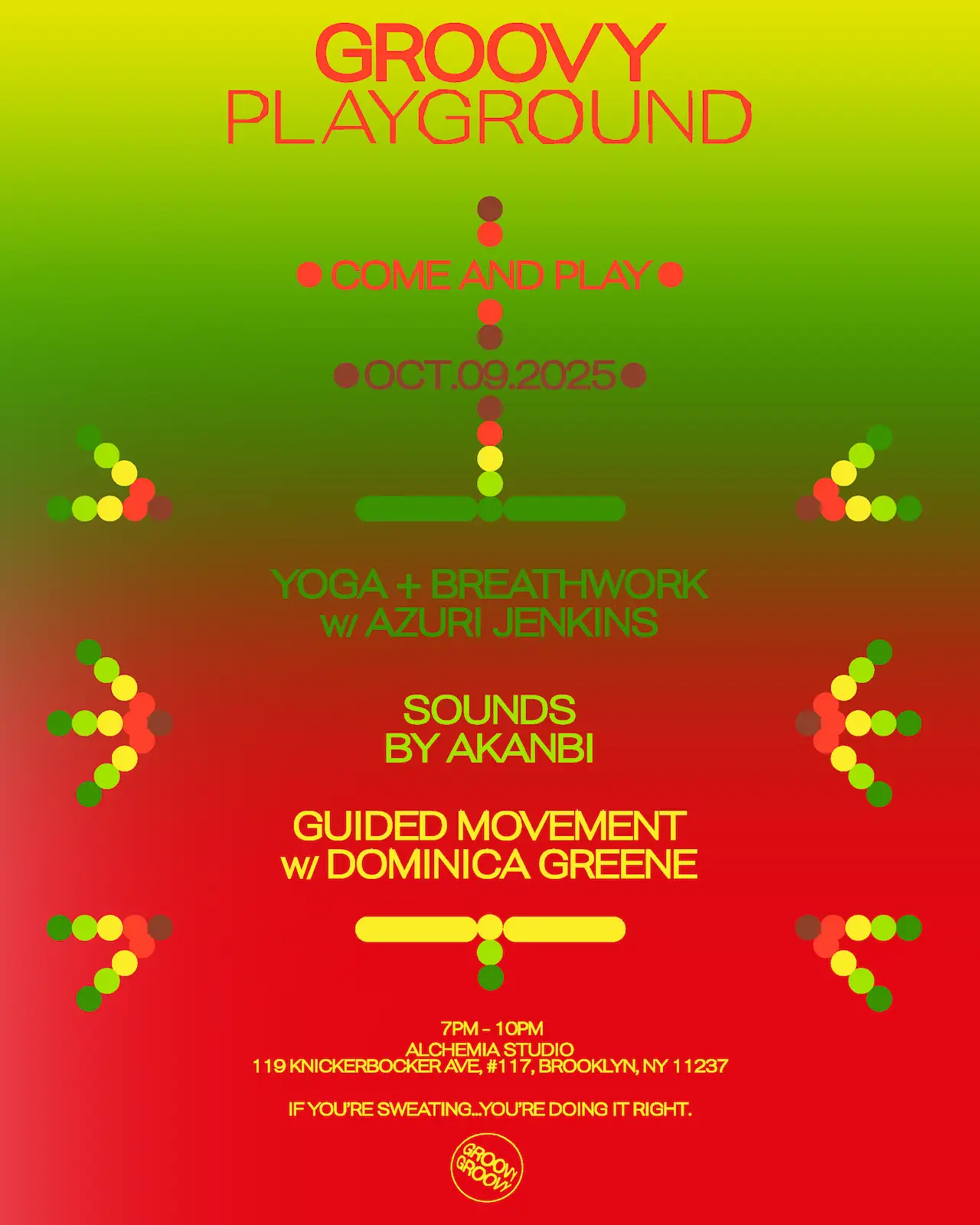 GROOVY PLAYGROUND The intention of this space is to experiment with the fusion of music magic, movement and the universal tools of wellness to improve our overall well being. You’re cordially invited to explore the playground and join us on this journey of discovery. PROGRAM Groovy Playground will commence at 7pm on Thursday, October 9 at Alchemia Studio in Bushwick, Brooklyn. Expect an immersive 3 hour session starting with some luscious sonic delights by Akanbi to settle us in. Once everyone is acclimated to the space, Dominica Greene will guide us through meditative, durational movement designed to open a path toward transcendence. We’ll take a 15-minute break before jumping into our final workshop with Azuri Jenkins. It will be a calming slow flow where we’ll focus on healthy alignment, softening tension, and creating space in both body and mind. Expect gentle movement, breathwork, and quiet moments of meditation. Open to all levels. The final 30-minutes of the playground is open for relaxation, connecting with your fellow playmates and a little boogie. Join us! GUIDED MOVEMENT w/ DOMINICA GREENE Dominica Greene is a Brooklyn-based conceptual artist, dancer, and facilitator whose practice lives at the intersection of movement and ritual. She approaches dance as one of the purest forms of expression; a channel of ancestral and existential knowledge. Her offerings blend somatic and durational practices to guide participants into trance states, opening space for spiritual connection and collective release. In her facilitation, she seeks to amplify dance as a universal force—not a skill to master, but a living, breathing rhythm we all embody simply by being alive. YOGA + BREATHWORK w/ AZURI JENKINS Azuri Jenkins (she/her) is a mother, full-spectrum birthworker, yoga teacher, and biodynamic craniosacral therapist based in NYC. For the last ten years, she has explored and shared the healing arts. Beginning her yoga teaching journey in 2015, Azuri came to understand the body not only as a vessel of expression, but as a living archive of wisdom, memory, and medicine. Through craniosacral therapy, reiki, and yoga, she developed a deep respect for the science of the body and its ability to support emotional, physical, and spiritual well-being. Today, her offerings weave somatic awareness, ancestral reverence, and spiritual care into intentional and inclusive spaces. Whether supporting families, guiding yoga classes, or offering bodywork, Azuri meets each person with softness, presence, and love. She believes in the power of conscious rest, rhythmic breath, and intuitive movement to restore connection to self and to the sacred cycles of life. SOUNDS by AKANBI Speaking from a place of child-like purity and unfiltered passion, Akanbi is the DJ (or, in his own words, simply “a shepherd to let the music play”) bringing his crowd back to what raving is all about: enjoyment, release, connection, and lots of sweat. The Lagos-born, New York-based artist refuses to confine himself to one style or genre – encompassing everything from meditation-inducing to hip-turning, his musical bouquet hits deep and burns slow. RESERVATIONS + LOCATION Groovy Playground will take place at a gorgeous air-conditioned yoga studio located at 119 Knickerbocker Ave, #117, Brooklyn, NY 11237. Entry is $30 and only 20 spots are available. Advanced tickets are highly encouraged to secure a spot. Arrive promptly at 7pm. Doors will be closed at 7:30pm. DINNER + DRINKS Dinner will not be provided. Food & drinks can be purchased at Crossroads Cafe, located at the entrance to the building on Knickerbocker Ave.