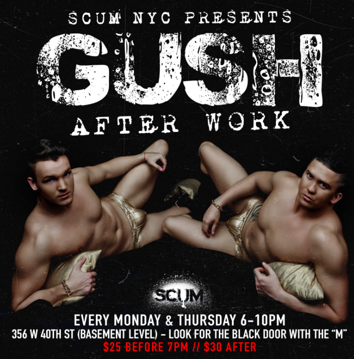 SCUM NYC Presents GUSH After Work - If you have an appetite for fun or just need to relive some pressure after work, join us every Monday and Thursday at 6PM in our NEW LOCATION - Details below