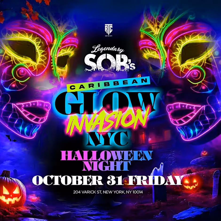 Celebrate Halloween at the Glow Party at SOBs in NYC! Dance all night to reggae, soca, dancehall, and afrobeats. Costumes, lights, and nonstop vibes! Halloween 2025 Friday Ocotber 31st at SOBs NYC 204 Varick St, New York, NY Playing Reggae, Soca, Dancehall and afrobeats