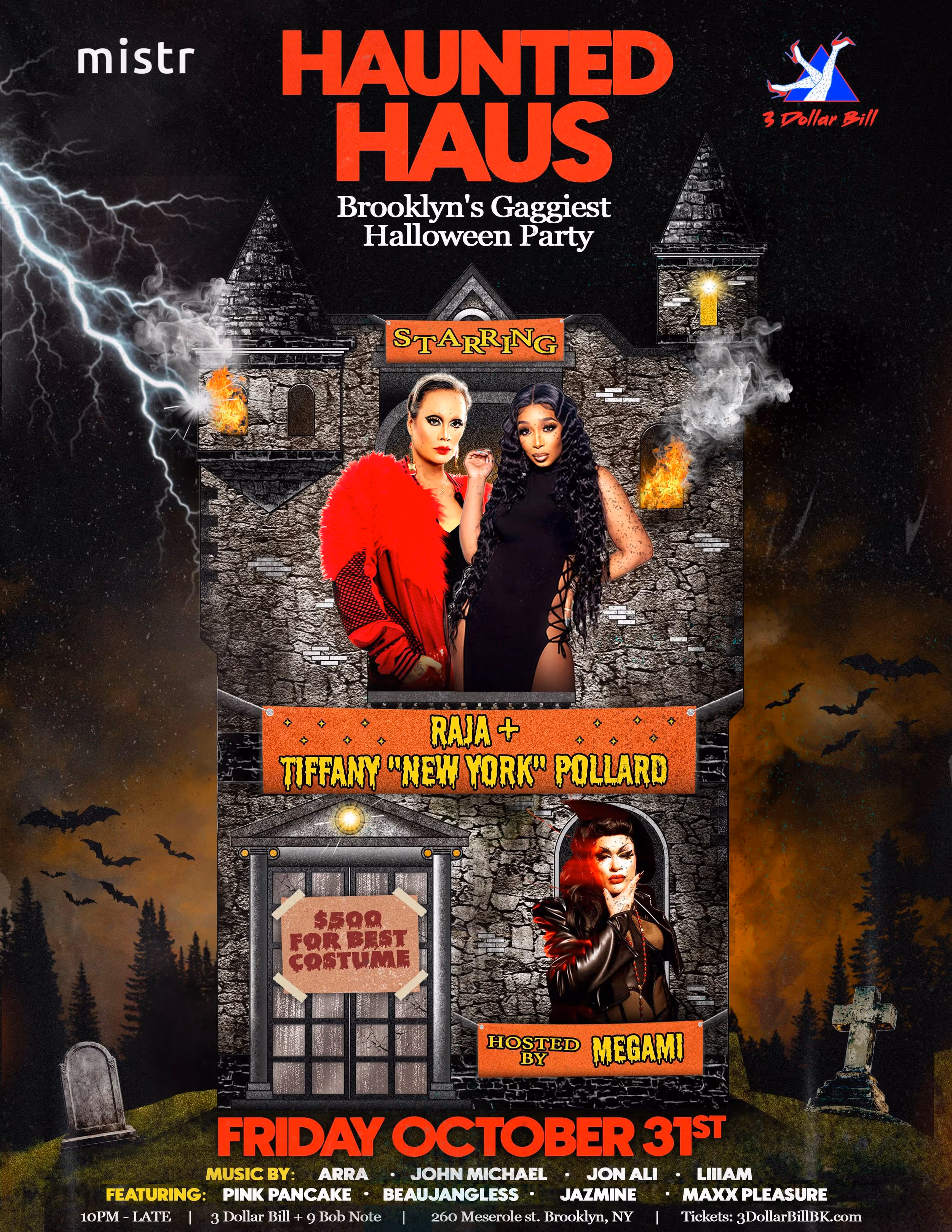 👻Haunted Haus👻 🎃 Brooklyn’s Gaggiest Halloween Party🎃 Friday, October 31 10:00 PM to LATE 🪩Two Dance Floors 💫Starring @sutanamrull + @tiffany_hbic_pollard 😈Host: @megaminyc 🎧Music by @xxoarra + @djjohnmichael + @jon_ali + @liam.m4a 👄Drag: @hausofpancake + @beaujangles + @showponii + @mr.mpleasure + @isthatjazmine Costume Contest 🧟 $500 Prize