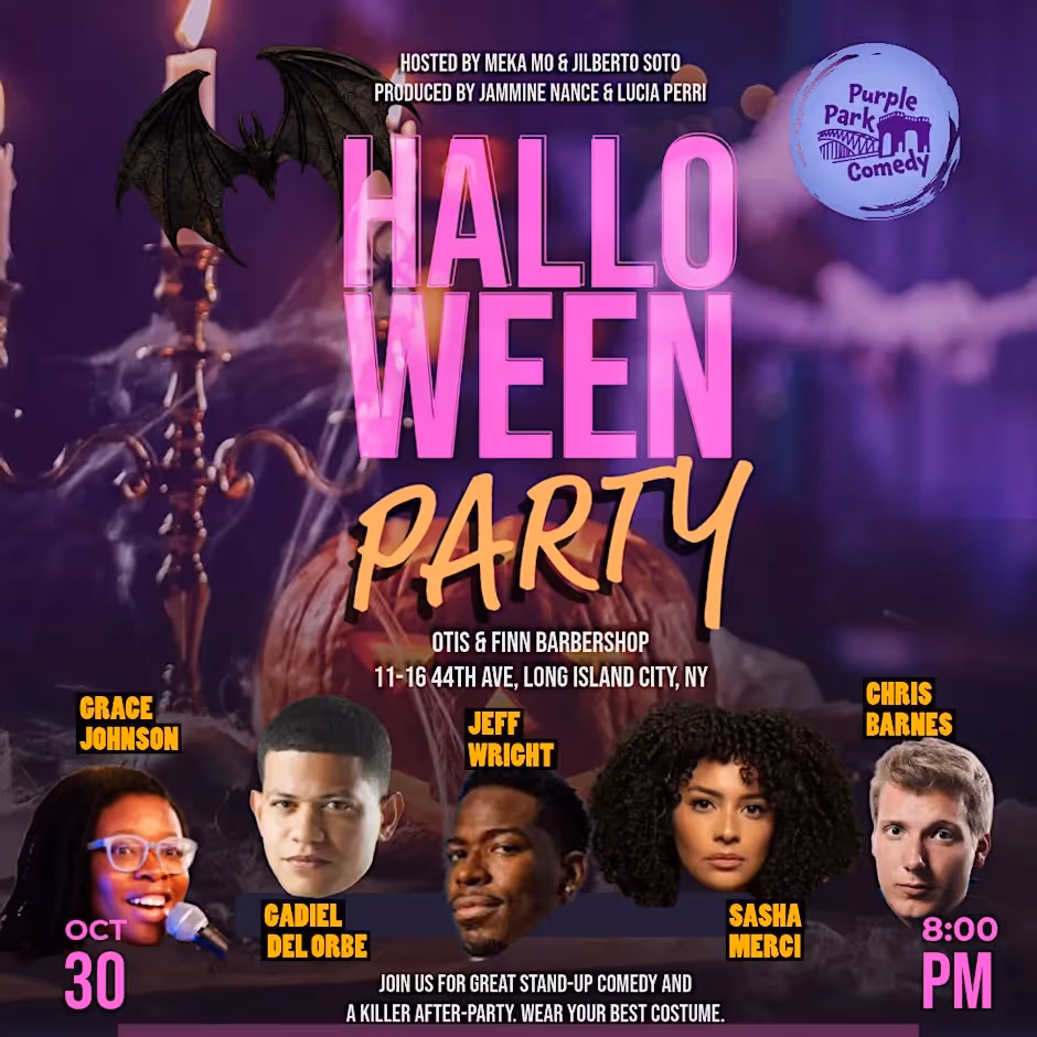 A Queer, BIPOC, Stand-Up Halloween Party! Purple Park Comedy Presents: Haunting the House Down! Your favorite comedy show is back with all the laughs and a few spooks this time around. Wear your best costume and join us for stand-up comedy and an after- party to DIE for! We are still delivering you the funniest, most diverse line-up from all over, all taking place in a barbershop! We provide free drinks to our audience members and we encourage you to bring your own bottles. Get ready to crack-up and Dance till you Die at Otis & Finn (11-16 44th Drive) on October 30, 2025 at 8:30 PM (Doors open at 8). Hosted by Meka Mo & Jilberto Soto! Comics Grace Johnson, Gabiel Del Orbe, Jeff Wright, Sasha Merci, Chris Barnes and More!