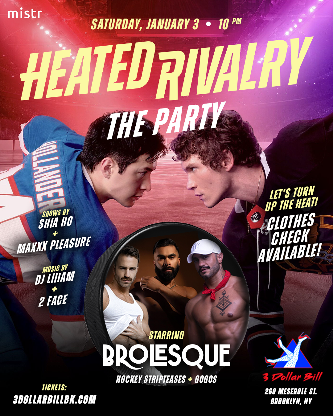 🏒Heated Rivalry🏒 The Party ❄️Saturday, January 3 10:00 PM 🥅 Hockey Striptease by @bro.lesque + @lockybrownlie Shows: @shiahonyc + @mr.mpleasure Music: @liam.m4a and 2 Face 🥅Dance Party! 🏒Shows! Want to wear hockey gear? Clothes check available! All are welcome, no dress code! Sponsored by: @heymistr Hotel Sponsor: @moxywilliamsburg