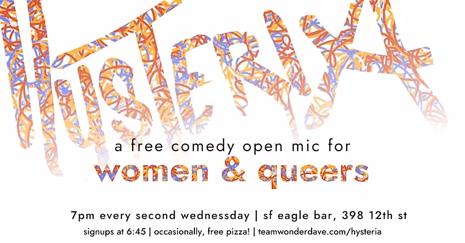 Get ready to laugh your heart out at the Hysteria Comedy Open Mic for badass women and fabulous queers. Every 2nd (and occasionally 5th) Wed Hysteria Comedy Open Mic is a FREE night of comedy where the ladies, gays, & theys of the SF bay area comedy scene hone their comedic skills. Come and get your giggles at this delightful night of inclusive comedy. Comedians get 5 minutes. Sign up starts at 6:45pm Show starts at 7pm. H appy hour drink specials at the SF Eagle for the first hour of the show :-) This is a monthly show every 2nd Wednesday of the month. When a month has 5 Wednesdays we do a BONUS open mic night on the 5th Wednesday