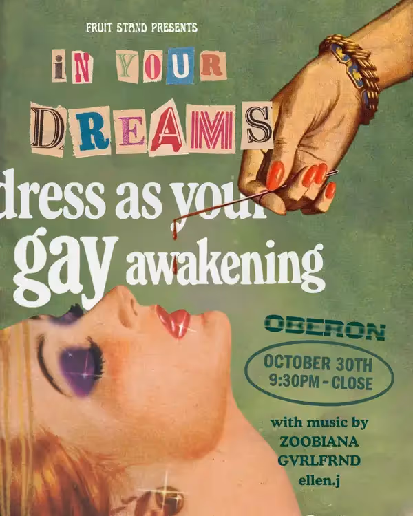 come kickoff halloweekend in the gayest way possible: by partying with a bunch of queers dressed as their gay awakenings!!! come for the friends, come for the music, come for the crushes? when: thursday october 30th where: oberon in williamsburg 9:30PM-late