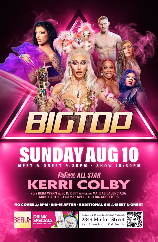 A Homo Disco Circus hosted by Hera Wynn with the Bay Area’s best drag performers and Rupaul’s Drag Race stars! This week, we have Kerri Colby of RuPaul's Drag Race coming to SERVE on the Beaux Stage. Featuring performances by... -Mahlae Balenciaga -Mojo Carter -Lici Makaveli DJ DEFT spins all night and the iconic Big Gogo Tops show off for you! Doors @ 8pm | Meet & Greet @ 9:30pm | Show @ 10:30pm | No Cover before 8pm