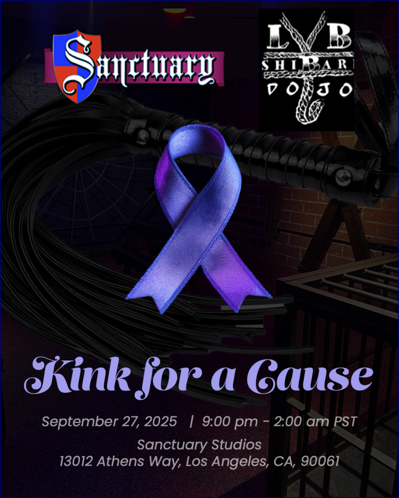 Kink for a Cause - Sanctuary Studios and the Long Beach Rope Dojo join forces for a night to remember filled with fun, excitement and BDSM to raise money for cancer research. This first of its kind event brings together the LA Kink Community to help beat and whip an illness that has touched us all in some way. Of course being kinky, we had to add our own unique spin to it. So come out and enjoy pain for your pleasure or pleasure for your pain while helping others. The offerings: - Live Stage Performances ranging from Flogging to Shibari to Fire Play. - A Silent Auction and a Raffle with donations from Stockroom, local artists and other generous donors. - Rope tastings and experiences provided by the Long Beach Rope Dojo. - Playrooms for your own enjoyment. - A Survivor's Bell for all those who have survived to ring and give hope. - And more to be announced... Tickets are $30 in advance or $40 at the door.