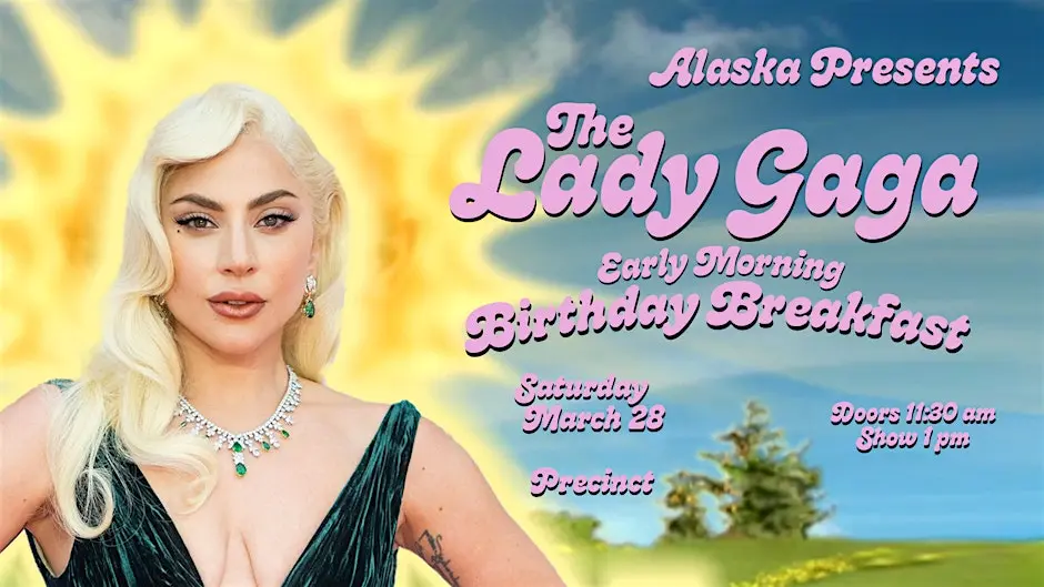 Celebrate the birth of our blessed mother, Stefani Joanne Angelina Germanotta, in a one-of-a-kind early morning birthday celebration event. Alaska Presents: Lady Gaga Early Morning Birthday Breakfast! March 28 comes but once per year. Celebrate the birth of our blessed mother, Stefani Joanne Angelina Germanotta, in a one-of-a-kind early morning birthday celebration event. Presented by Alaska in conjunction with Precinct DTLA, the first ever Lady GagaEarly Morning Birthday Breakfast will be a moment of reverence, joy, and giving thanks to the woman who has given us such hits as "Party Nauseous," "Cake Like Lady Gaga," and "Brooklyn Nights." Set your alarm to wake up bright and early, or simply stay up very late from the night before-- Come together on this one day in celebration of Lady Gaga's 40th birthday. Reserve quickly as tables are limited. If sold out there is no cover to enter the bar and order from the front bar and patio with view of the show via TV monitors. Doors open at 11:30 am Show at 1 pm The venue is only 21 years old and up.