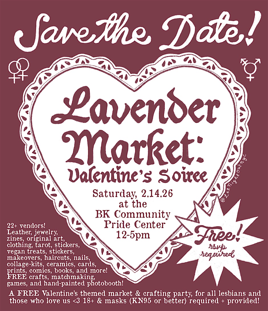 A Valentine's themed lesbian market, featuring 20+ vendors, treats, matchmaking, FREE community crafts (come make valentines!), & more! Lavender Market is a recurring art + free resources market hosted and organized by lesbian event group Lez Night Out! Join us February 14th for a very special Valentine's edition of Lavender Market! Featuring 20+ lovely vendors, cozy community crafts (come make Valentines with us!), tarot, raffles/giveaways, and yummy vegan treats... you won’t want to miss it! Bring a date, some friends, or just yourself ;) Please note this event is 18+!!!